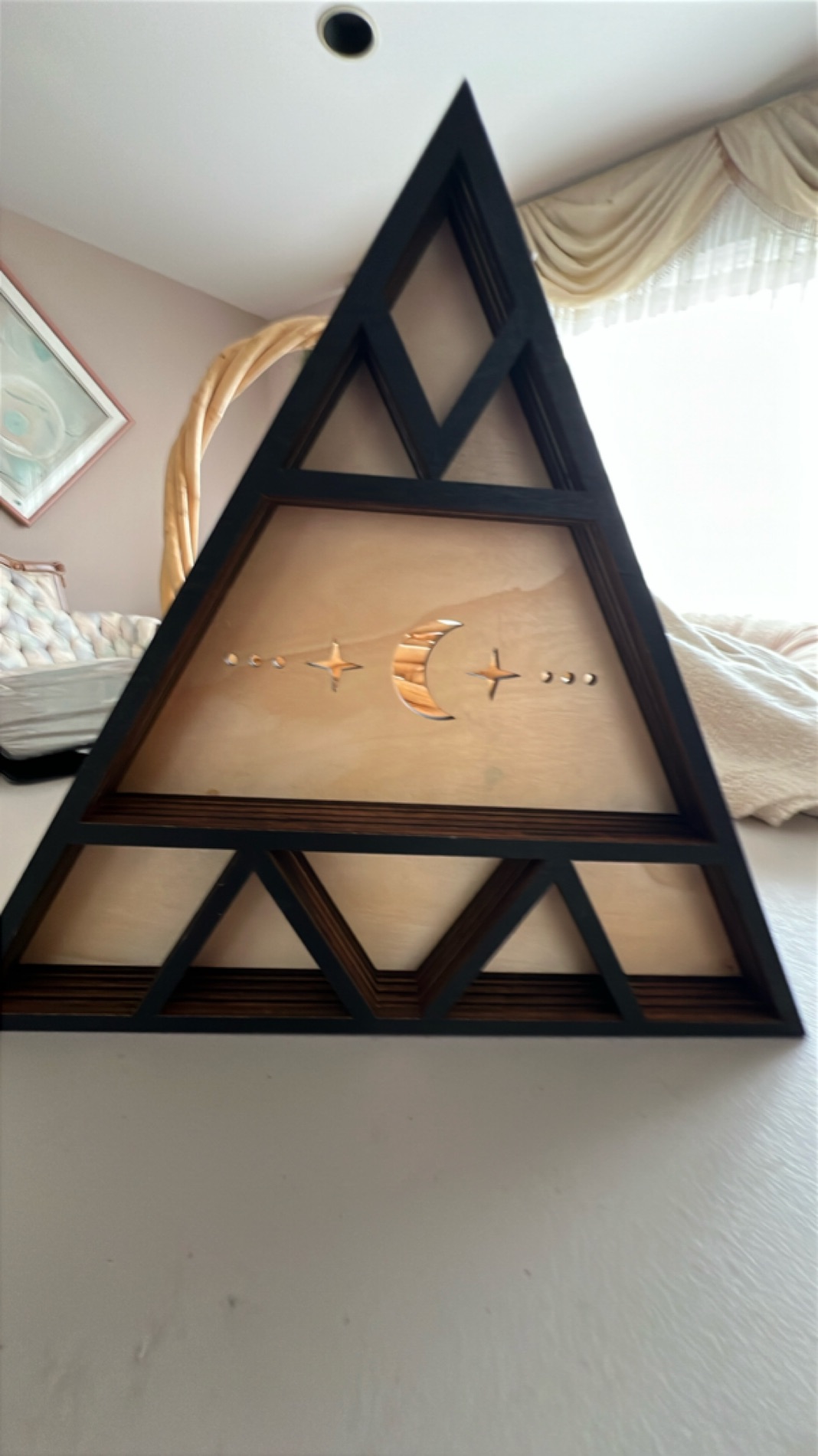 This unique triangular wall shelf features an eye-catching geometric design, perfect for adding a modern touch to any room. With intricate celestial cut-out details, this shelf is both functional and artistic. Ideal for displaying small plants, candles, or collectibles, it is crafted from sturdy wood with a black finish, ensuring durability and style. A great addition to any living space or office decor.