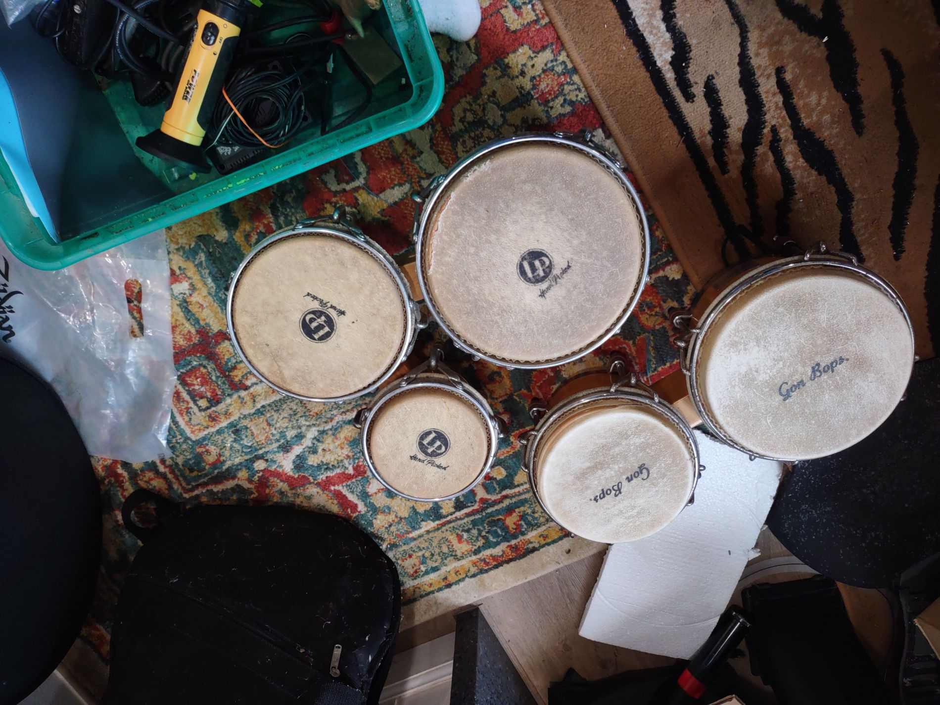 This is a set of Latin Percussion (LP) congas, renowned for their quality and traditional craftsmanship. The set includes multiple drums with natural rawhide heads that produce a rich, authentic rhythm sound. Perfect for both amateurs and professional percussionists, these congas are ideal for live performances or studio recordings.