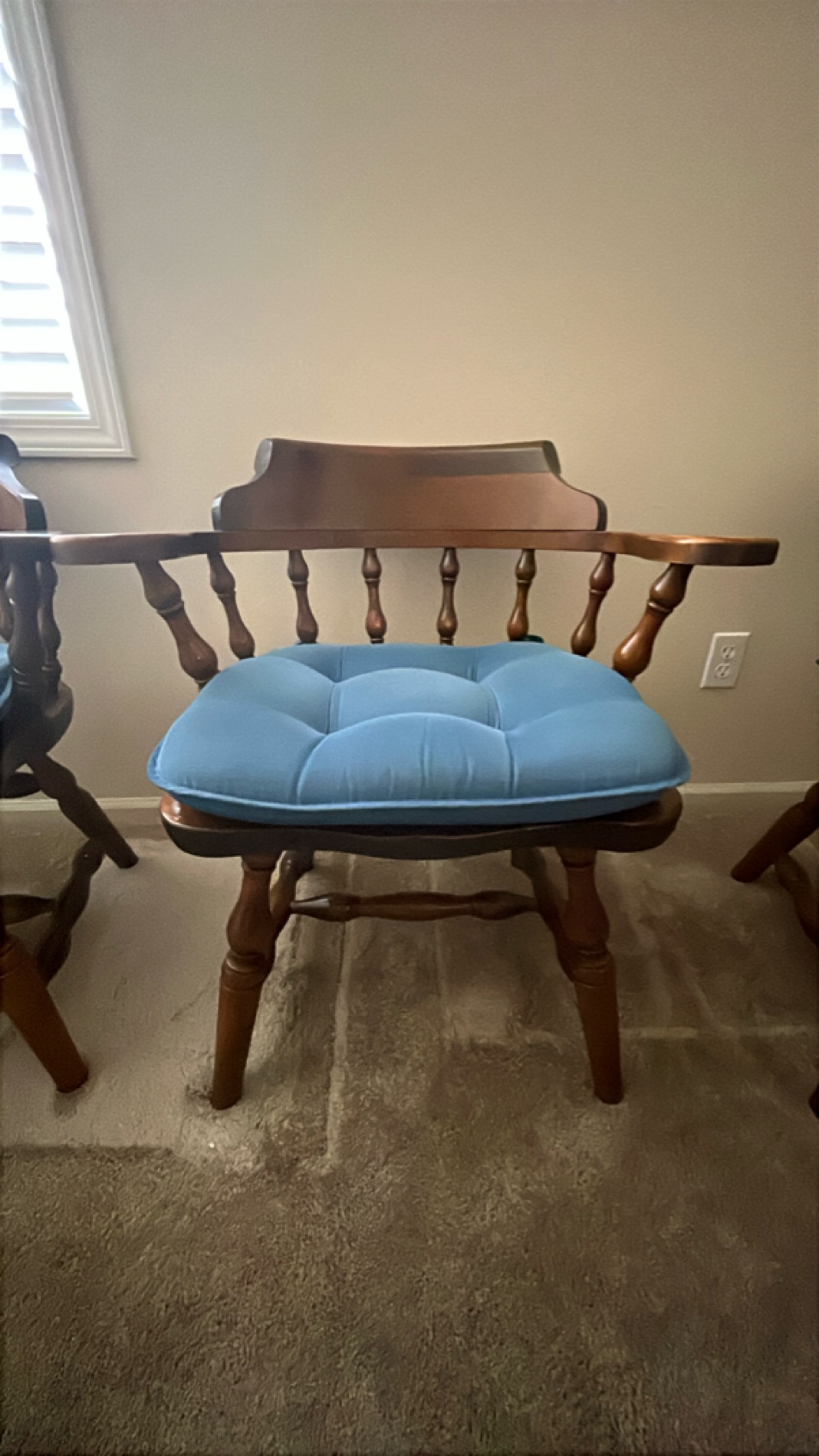 This elegant wooden spindle armchair features a classic design with a comfortable, plush blue cushion. Perfect for any living space, it combines timeless aesthetics with modern comfort. The chair is sturdy and well-maintained, making it a great addition to both traditional and contemporary decor styles.