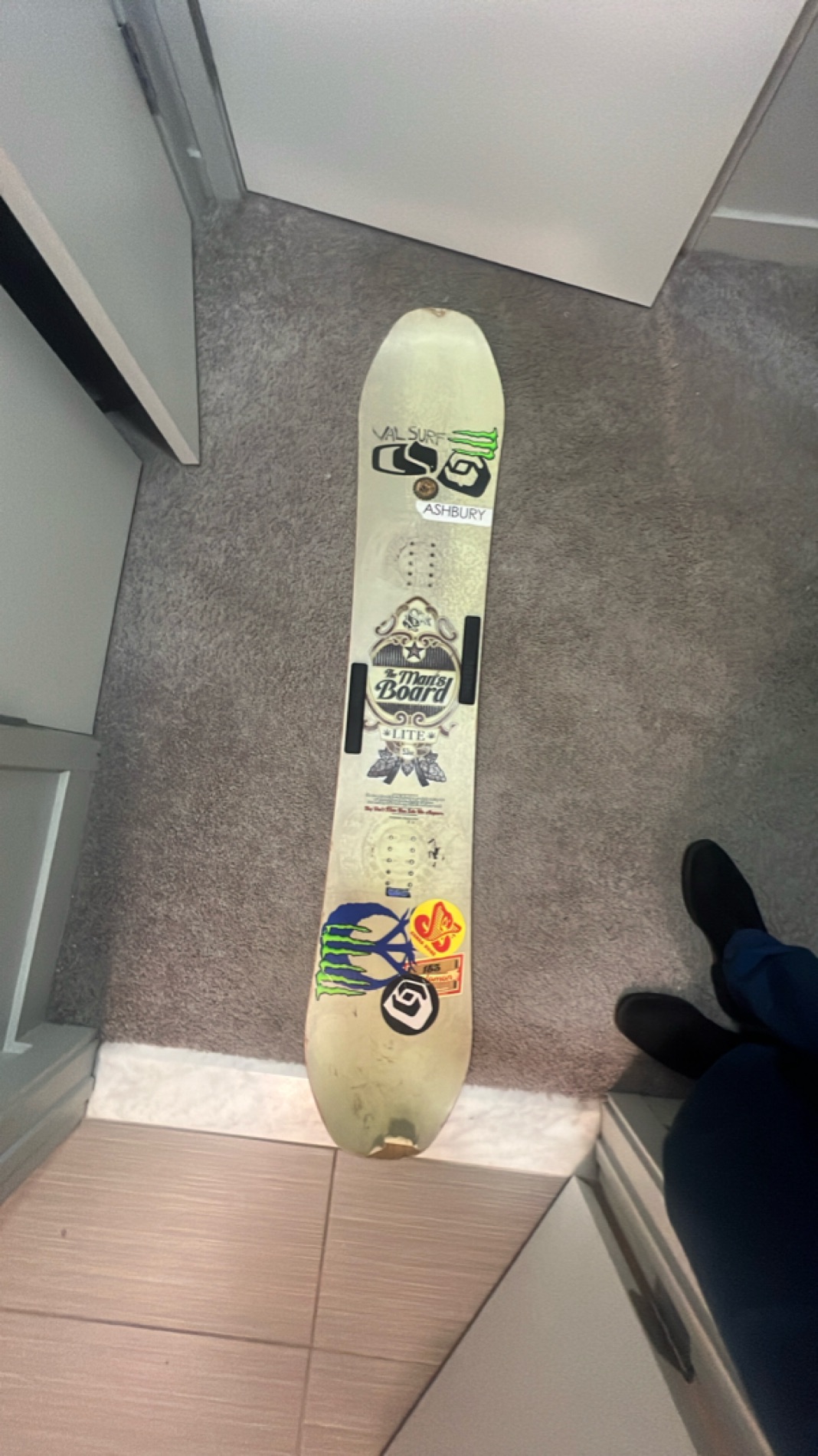 This is a pre-owned snowboard featuring a stylish array of custom stickers adding personal flair. Well-suited for both recreational and intermediate snowboarders, the snowboard is designed to offer stability and control on the slopes. With a sturdy construction, it provides durability necessary for multiple seasons of shredding.
