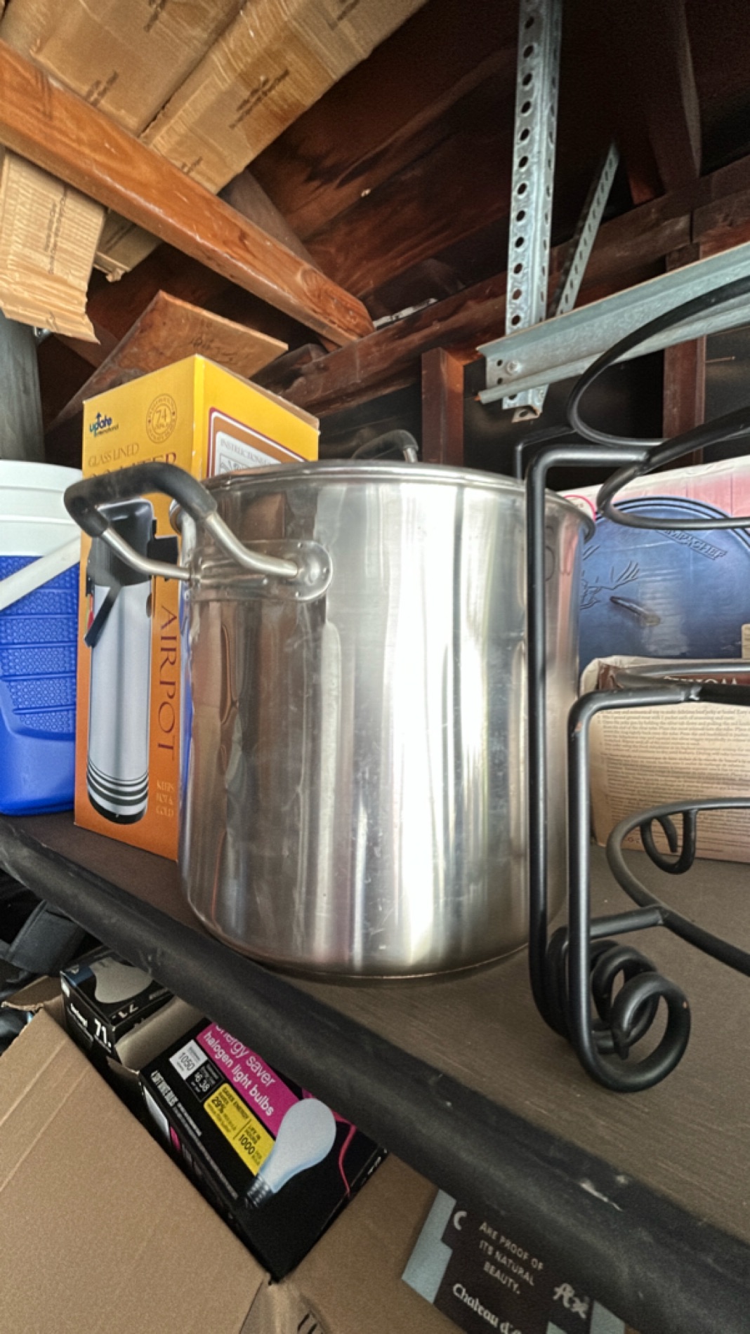 This is a durable stainless steel stock pot, perfect for cooking soups, stews, and large meals. The pot features sturdy handles for easy lifting and a polished finish that adds a sleek look to any kitchen. Its large capacity makes it ideal for family-sized portions or batch cooking.