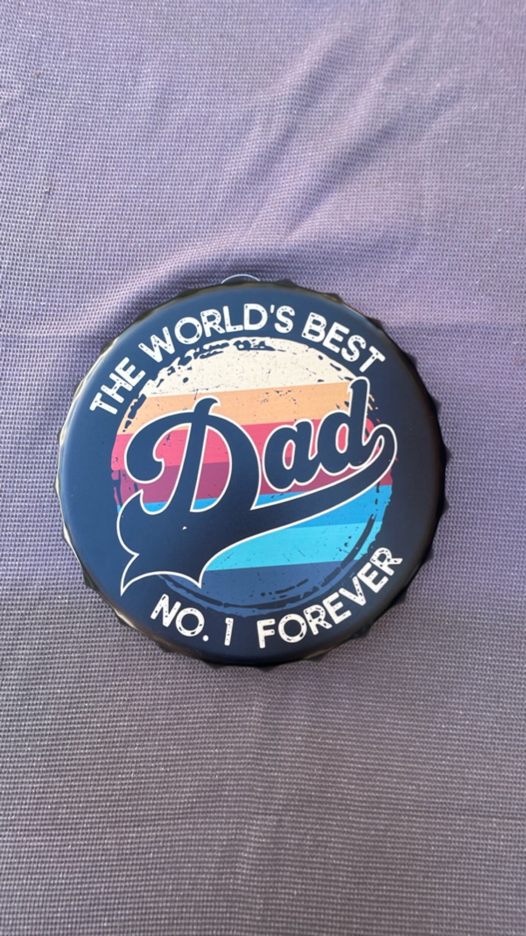 This is a vintage-style bottle cap wall decor featuring the phrase "The World's Best Dad No. 1 Forever." With a retro design and colorful text, it's perfect for personalizing a kitchen, bar, or man cave. Crafted from durable metal, it's an ideal gift for Father's Day or any occasion to celebrate a special dad.