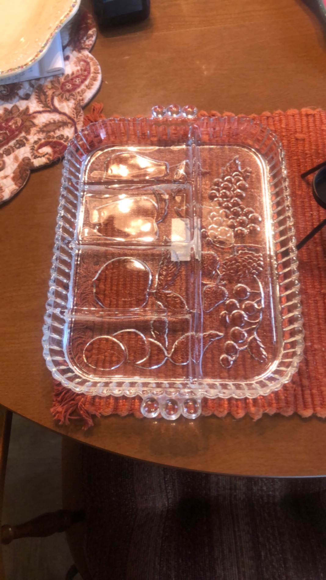 This elegant vintage glass serving tray features beautiful etched fruit patterns, perfect for adding a touch of sophistication to any dining occasion. With multiple compartments, it's ideal for serving a variety of snacks or appetizers. The sturdy, clear glass design boasts a classic aesthetic that is both timeless and versatile. Suitable for any special occasion or as an eye-catching display piece.