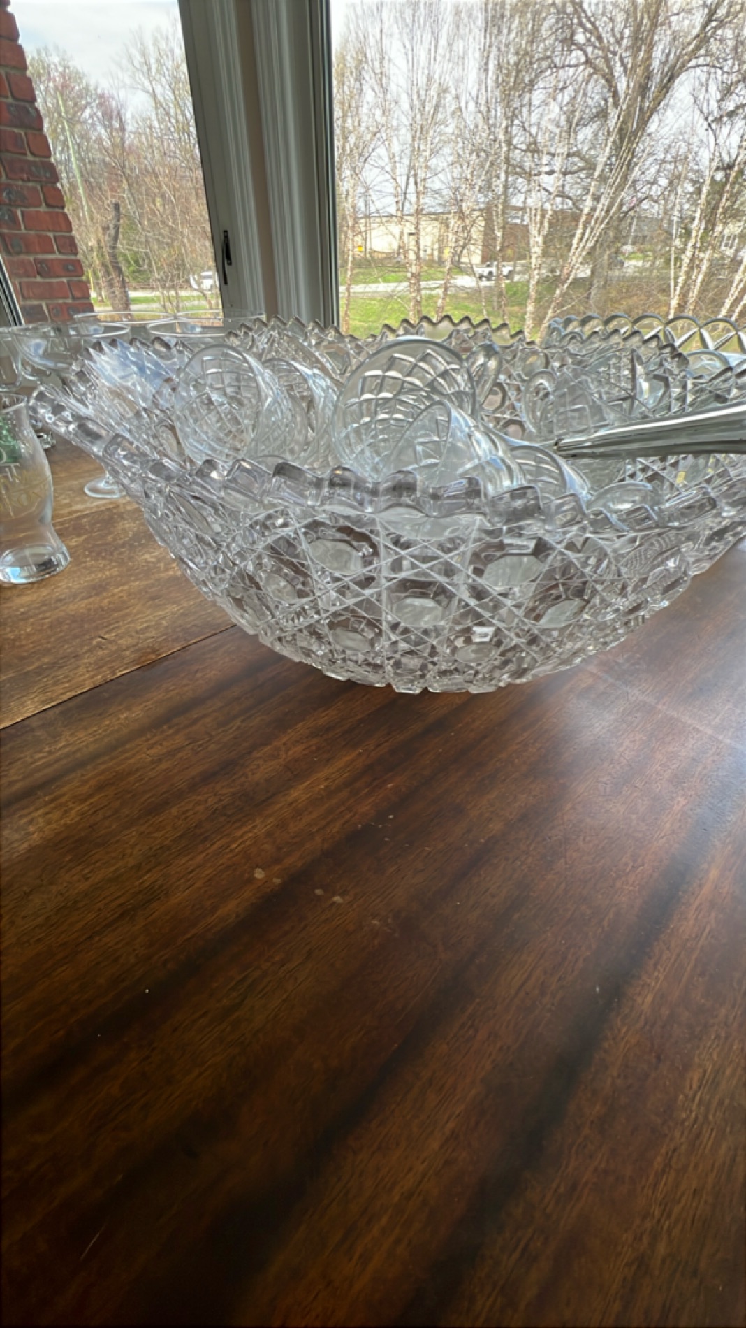 This stunning crystal punch bowl set features an intricately cut design, perfect for elegant entertaining. The craftsmanship highlights its timeless beauty, making it a wonderful centerpiece for any gathering. Ideal for serving punch or showcasing as a decorative piece. Includes matching ladle and cups to complete the set.