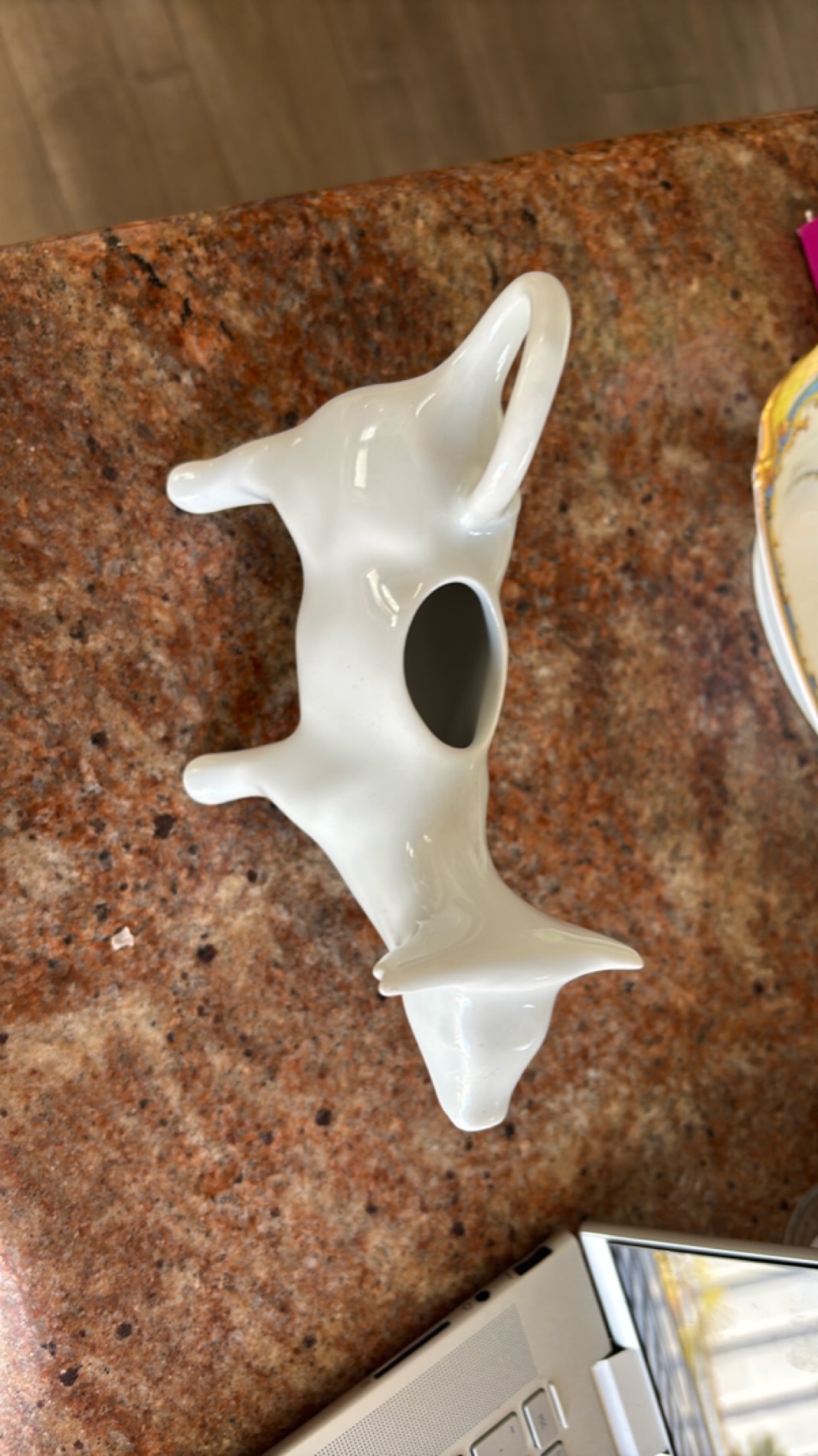 This is a ceramic cow-shaped creamer, perfect for adding a touch of charm to your kitchen or dining room. It is designed for pouring milk or cream into your coffee, tea, or cereal. The simple white design complements various kitchen decors. Its playful yet functional design makes it a delightful addition to any table setting.