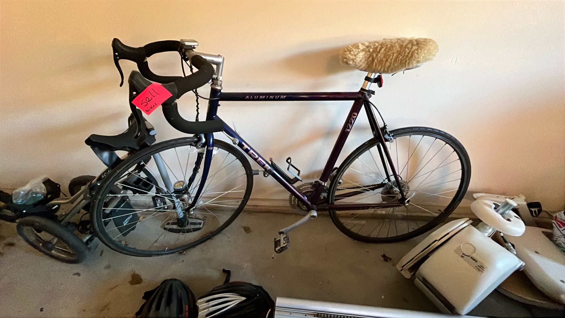 This is a Trek 1220 road bike featuring an aluminum frame, ideal for those looking to enjoy a smooth and efficient ride. It comes with a comfortable, sheepskin-covered seat, enhancing your biking experience. The bike is equipped with reliable components that ensure a sturdy performance. It has been well-maintained and is in good condition, ready for immediate use on urban roads or light trails.