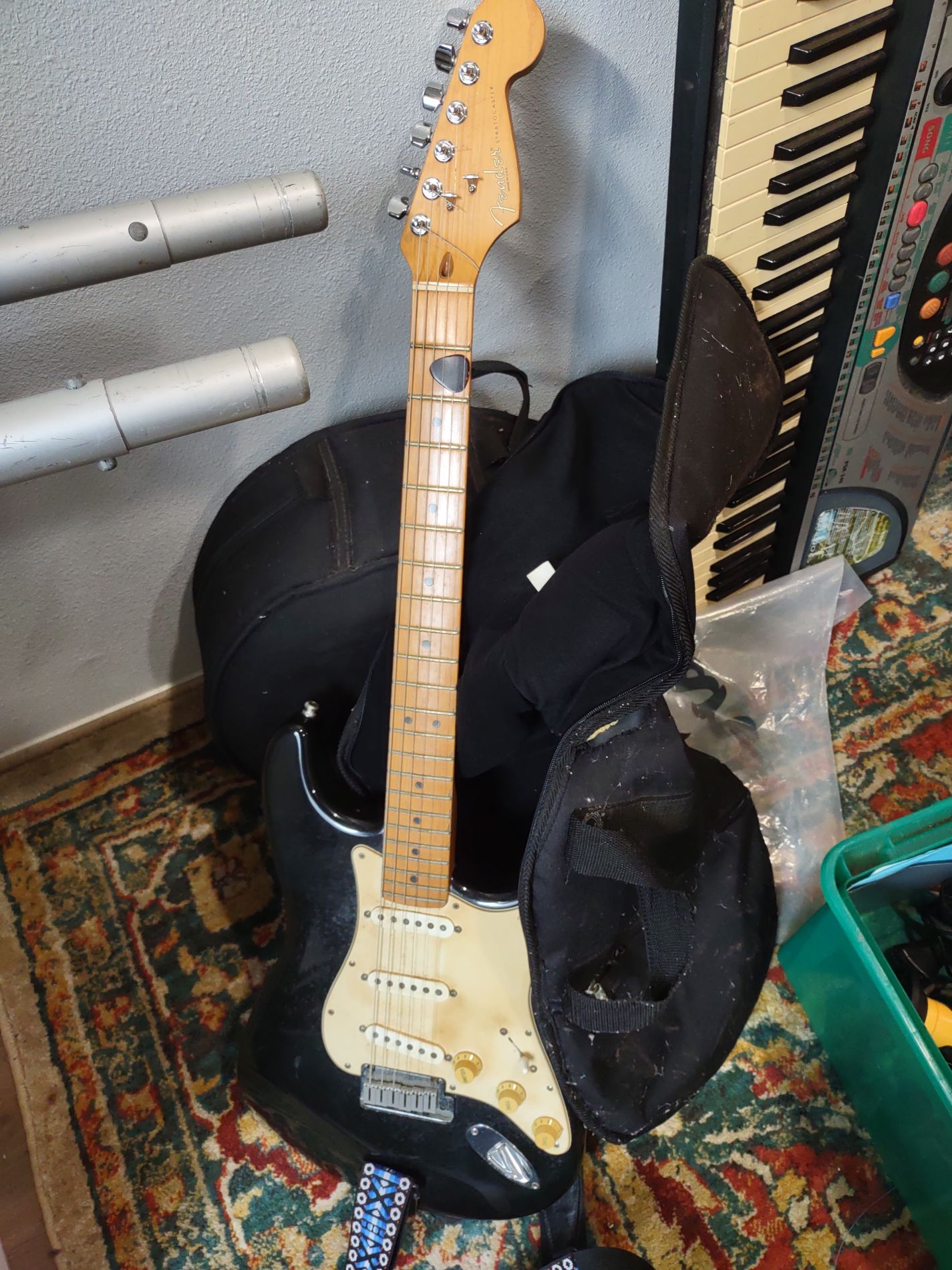 This is a classic Fender Stratocaster electric guitar, known for its versatile sound and iconic design. The guitar features a sleek black finish with a maple neck and fretboard. It includes three single-coil pickups and a vintage-style tremolo bridge. Overall, the instrument is in good condition, showing some minor signs of use typical for a used guitar. It comes with a soft gig bag for easy transport and protection.
