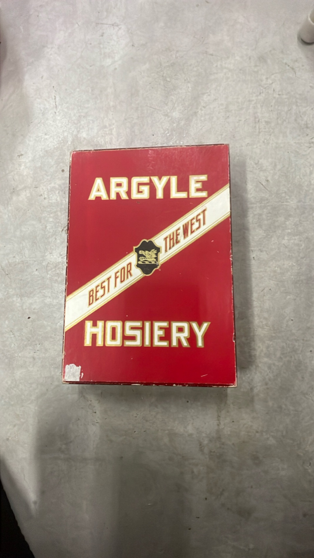 This is a vintage Argyle Hosiery box, showcasing a classic red design with bold lettering. Perfect for collectors or those interested in retro packaging, this item adds a touch of nostalgia to any collection. The box features a 'Best for the West' slogan, indicating its historical significance in hosiery branding. Whether for display or storage, this item is a unique find.