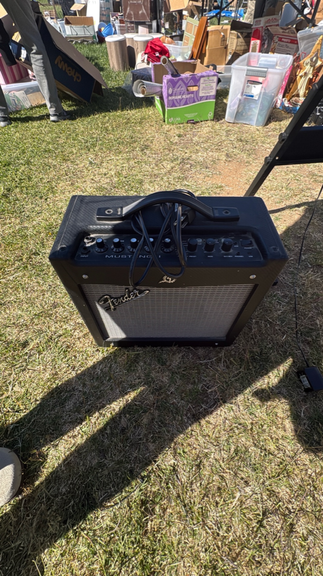This is a Fender Mustang guitar amplifier, perfect for musicians looking for a versatile and reliable amp. It features a solid construction with multiple control options for tone customization. Ideal for practice or small gigs. The amplifier showcases some wear typical of a used item but is in overall good working condition.