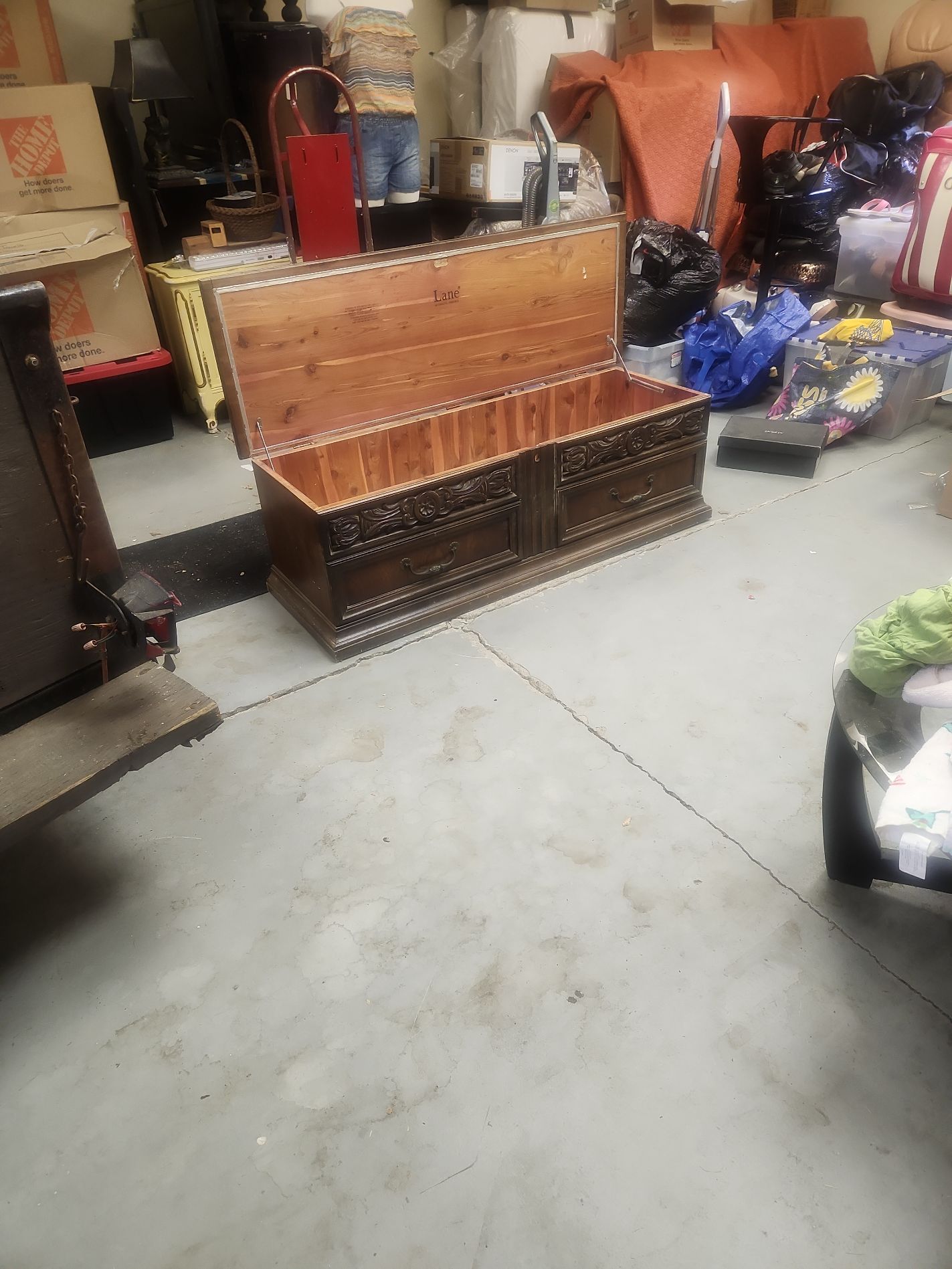 This is a beautiful vintage Lane cedar chest, perfect for storing blankets, linens, or keepsakes. The chest features intricate carved detailing and two front faux drawers for a classic look that adds elegance to any room. The interior is lined with cedar wood, known for its natural moth-repelling properties, making it ideal for storage. Overall, it's a sturdy and functional piece that combines aesthetic appeal with practical use.
