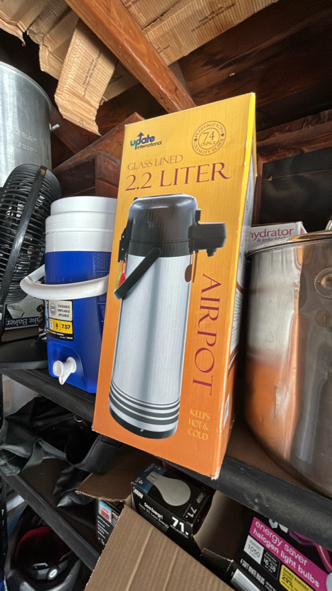 This is a 2.2-liter glass-lined airpot from Update International, designed to keep your beverages hot or cold for extended periods. The airpot features a convenient lever-action pump for easy dispensing and is perfect for both personal and professional use. Ideal for catering events, offices, or home gatherings, it offers a sleek and durable stainless-steel exterior with a large capacity to serve multiple people.