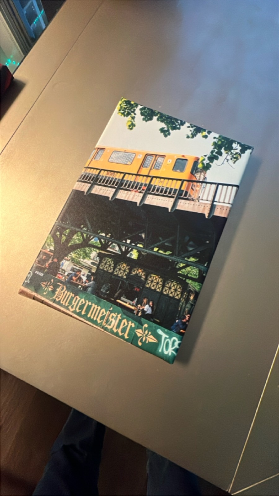 This is a high-quality canvas print featuring a scenic view of the Burgermeister with an iconic Berlin U-Bahn train above. The canvas is stretched over a solid wooden frame, providing durability and maintaining its shape. This piece is perfect for those who appreciate urban landscapes and want to add a touch of Berlin's charm to their home or office decor.