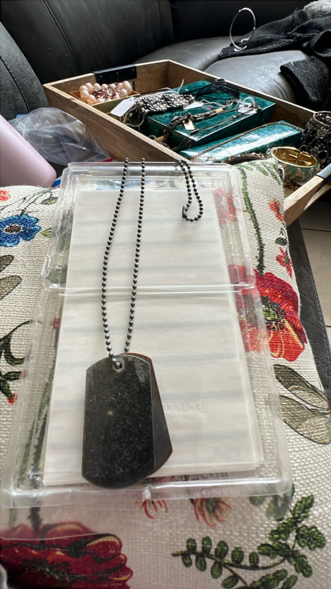 This is a sleek, black dog tag necklace featuring a minimalist design that adds a stylish touch to any outfit. The dog tag is attached to a ball chain, making it comfortable for daily wear. Perfect for gifting or personal use, it exudes a modern, understated elegance.