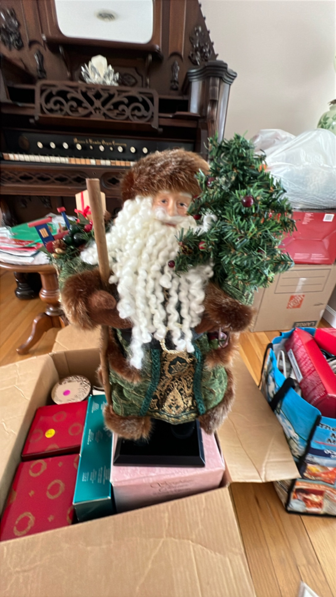 This finely crafted vintage Santa Claus figure stands as an exquisite holiday decoration. Dressed in intricate traditional attire with detailed embroidery, this Santa is a perfect addition to enhance your festive ambiance. Holding a decorative tree and adorned in luxurious faux fur, its craftsmanship adds a touch of elegance to any holiday collection. Ideal for displaying on mantels or tabletops.